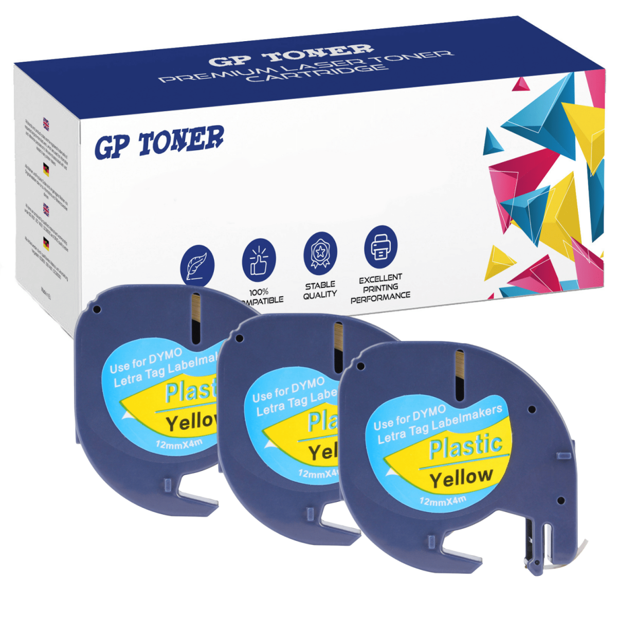 3x Dymo LetraTag 59423 Tape 12mm x 4m Yellow Plastic - replacement GP-DY59423 x3