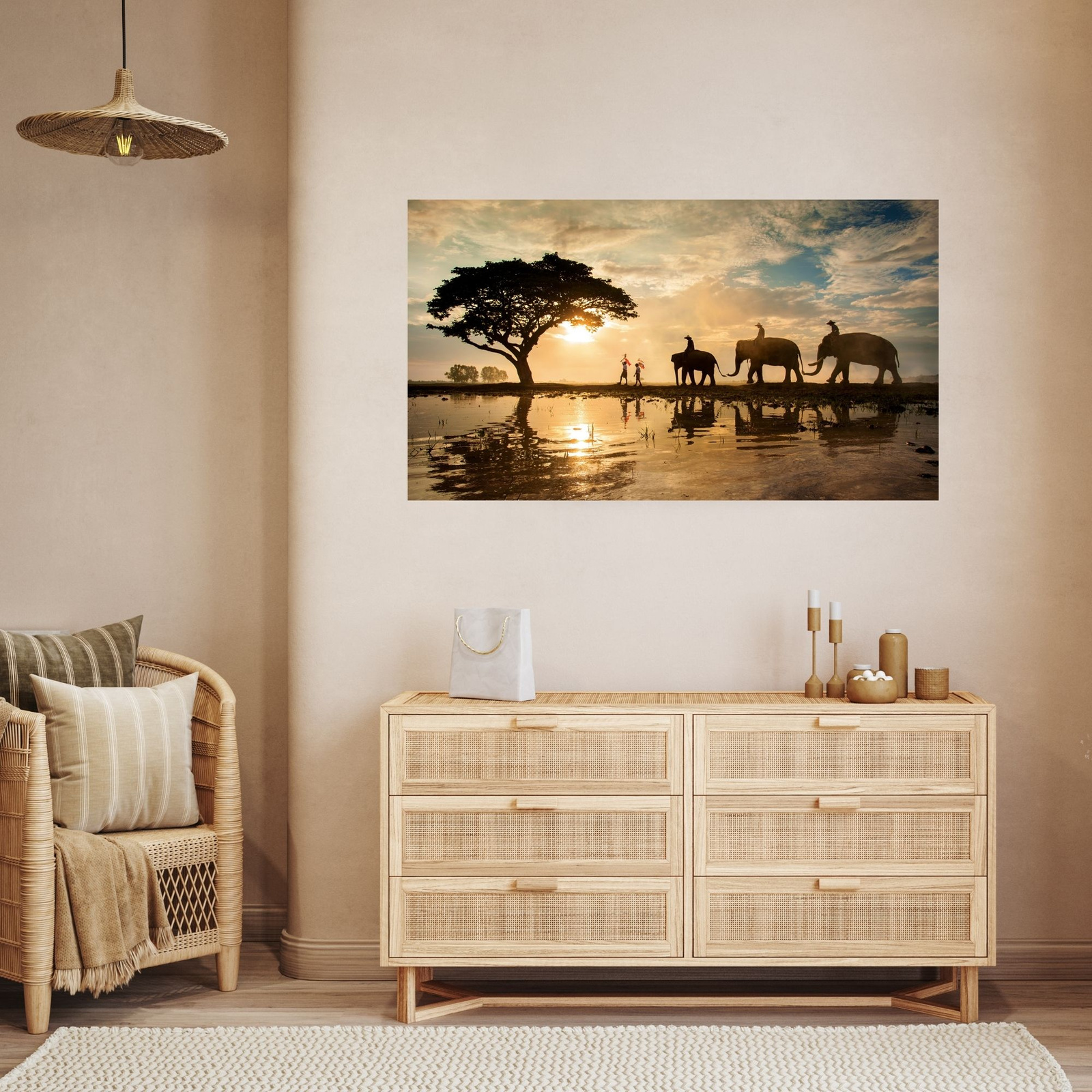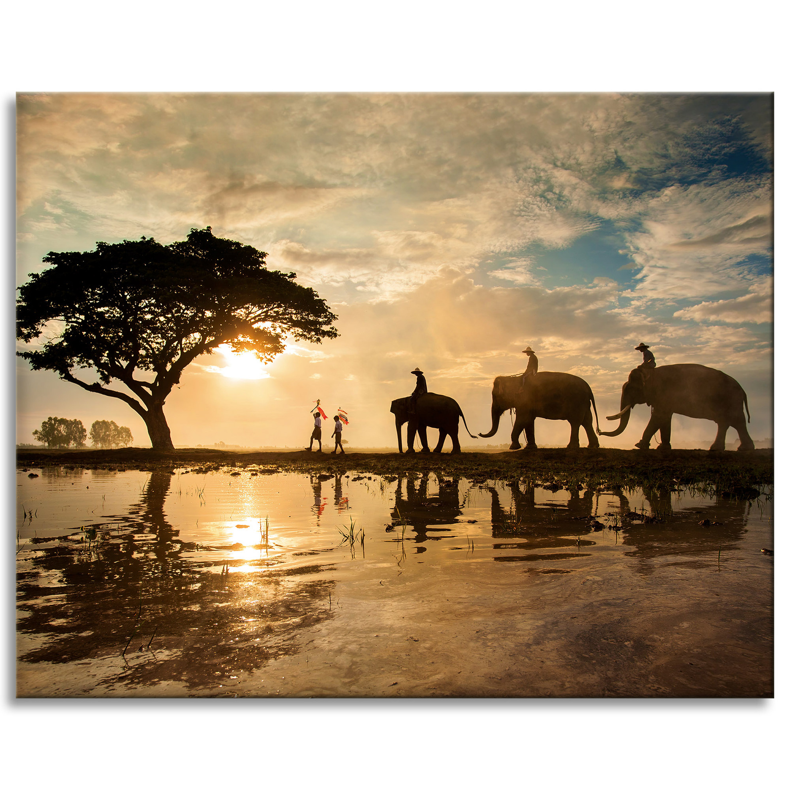 Canvas Print People on Elephants Sunset Africa Savannah 100x80 cm