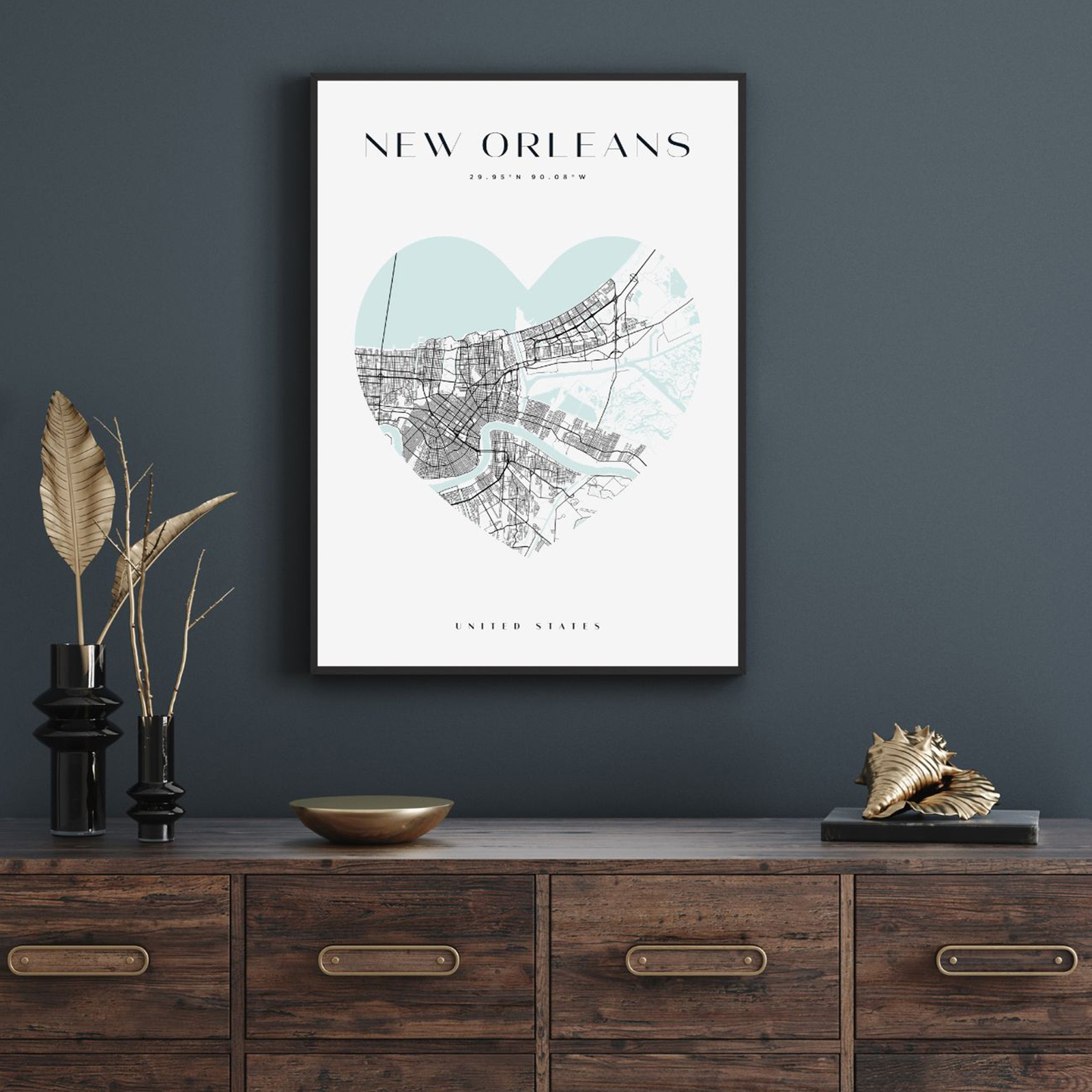 Poster New Orleans city map heart 40X50 cm + gold frame